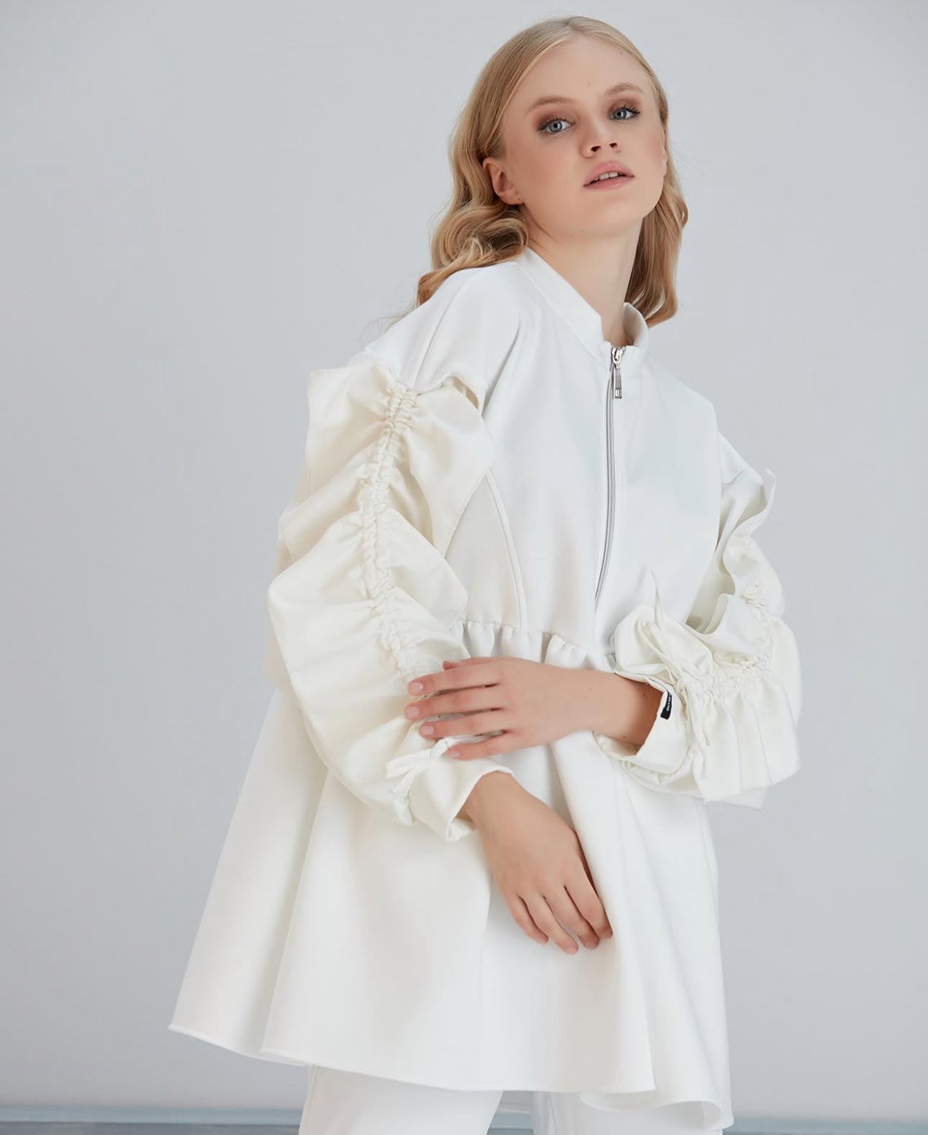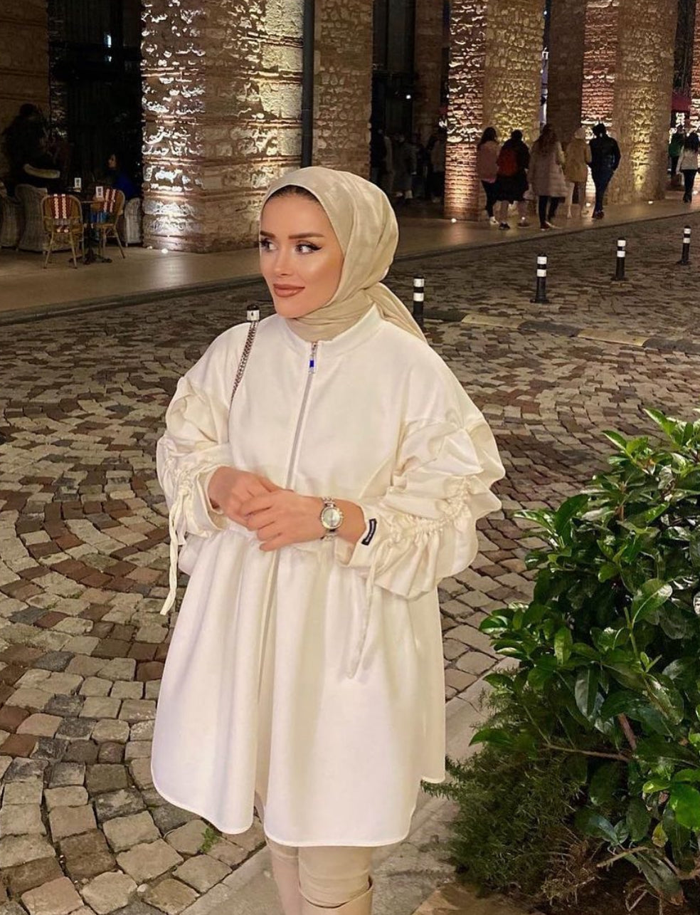 Alkantra Kapüşonu Kürklü Hırka - Krem